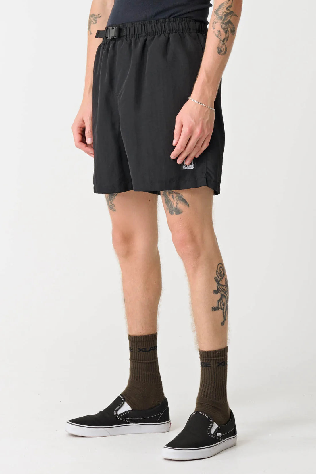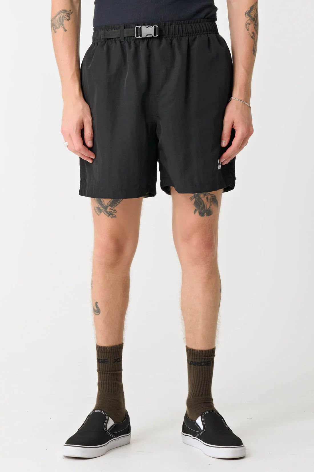 The 91 Hike Short in Black is a elasticated waist short with an external buckle closure.