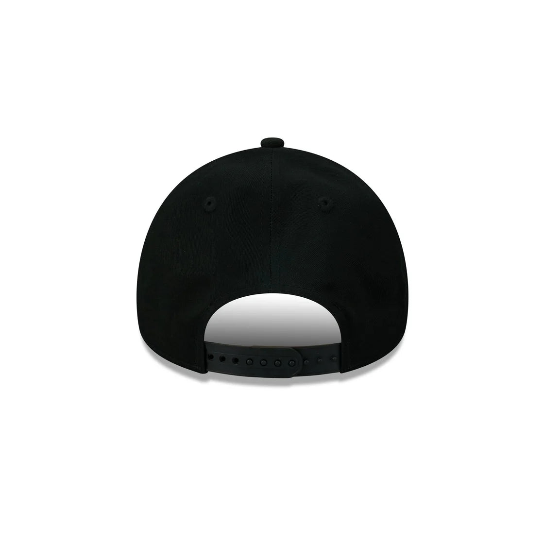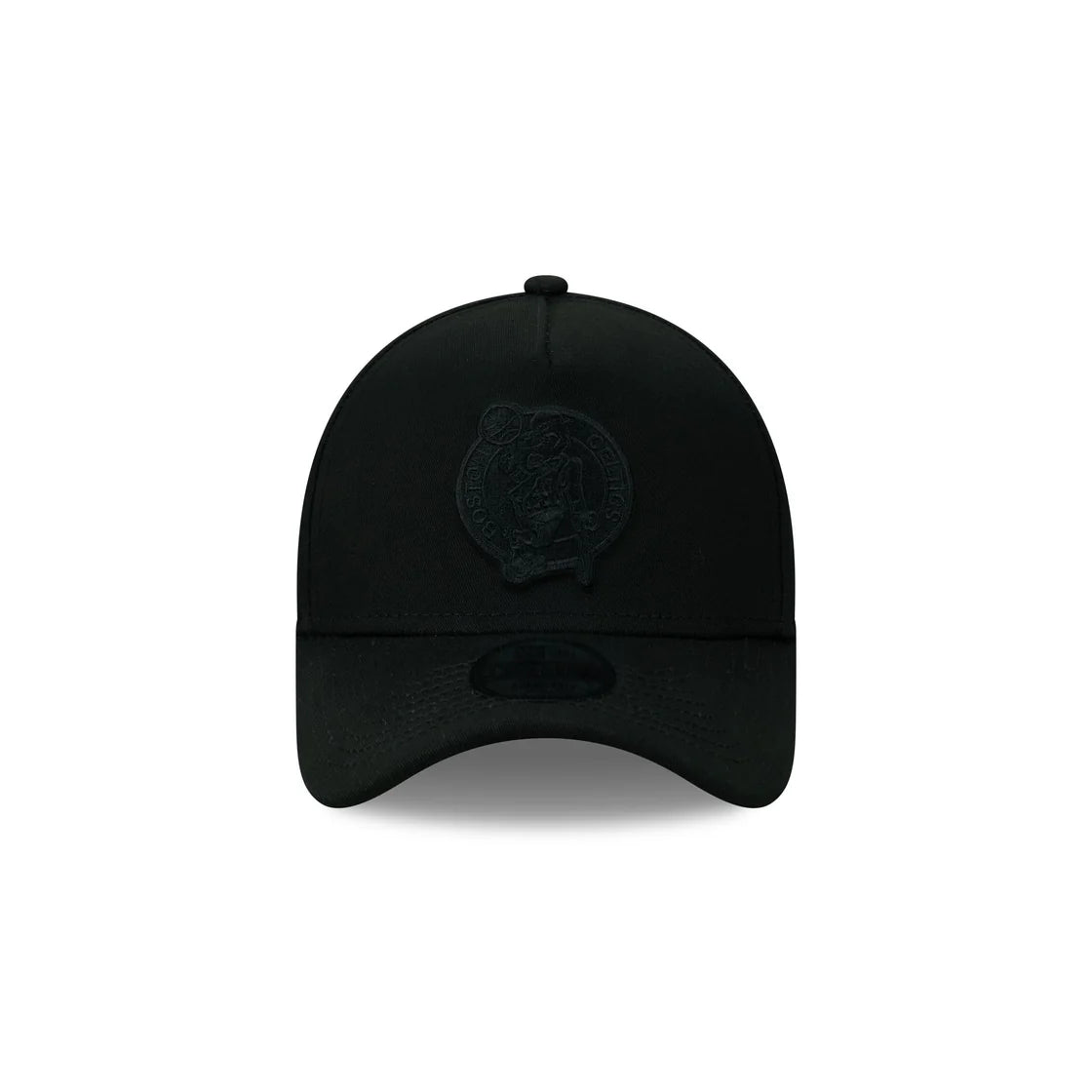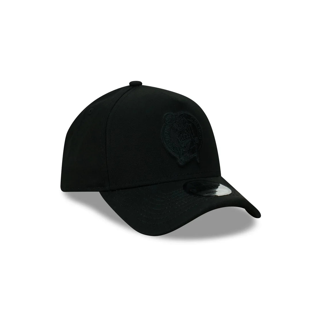 The Boston Celtics NBA Essentials Black on Black 9FORTY A-Frame Snapback features an embroidered black Celtics logo on the front panels of a pitched structured crown with a snapback enclosure at the back.