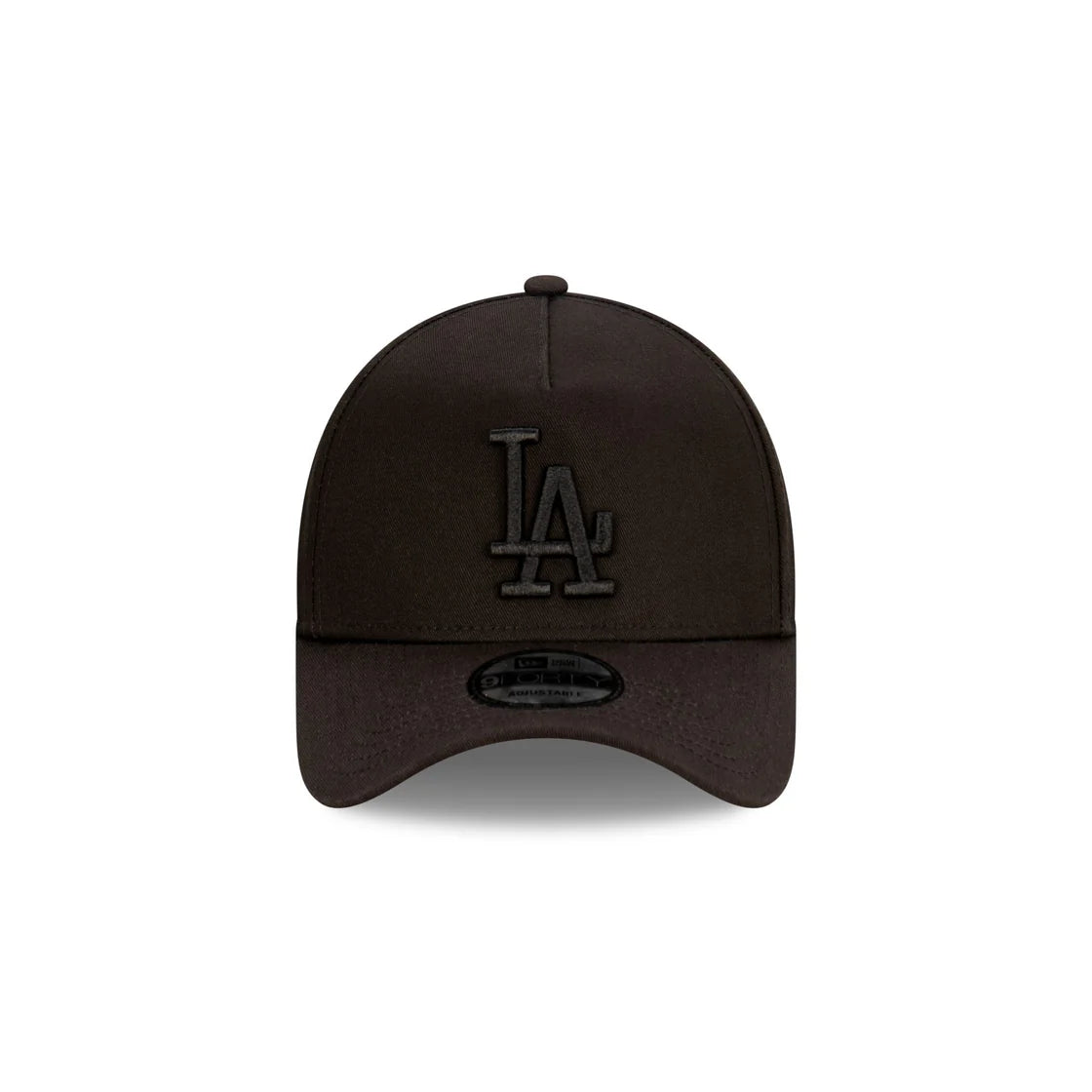 The Los Angeles Dodgers MLB Essentials Black on Black 9FORTY A-Frame features an embroidered Dodgers logo at the front panels with a tonal NE Flag on the left side.