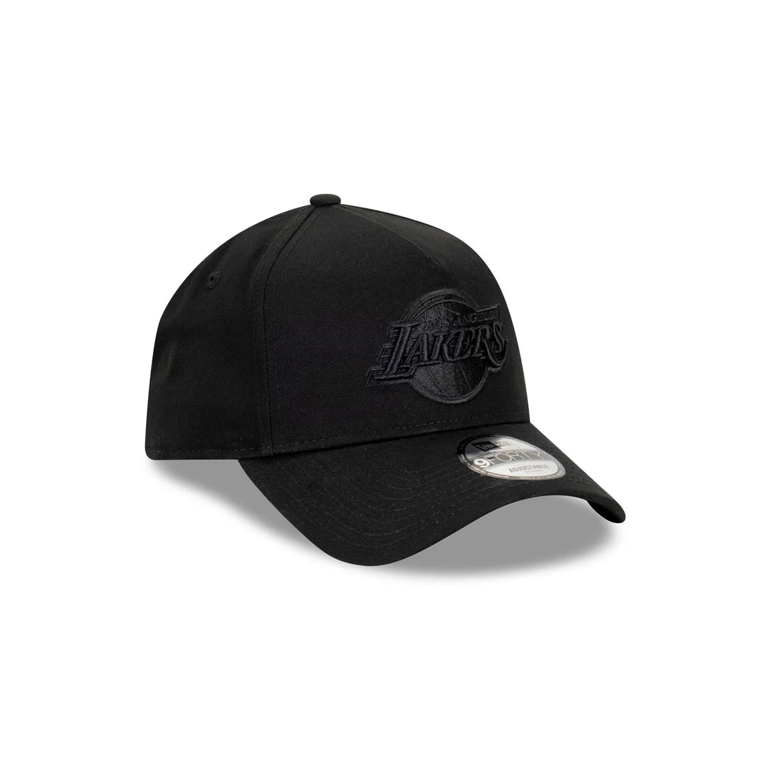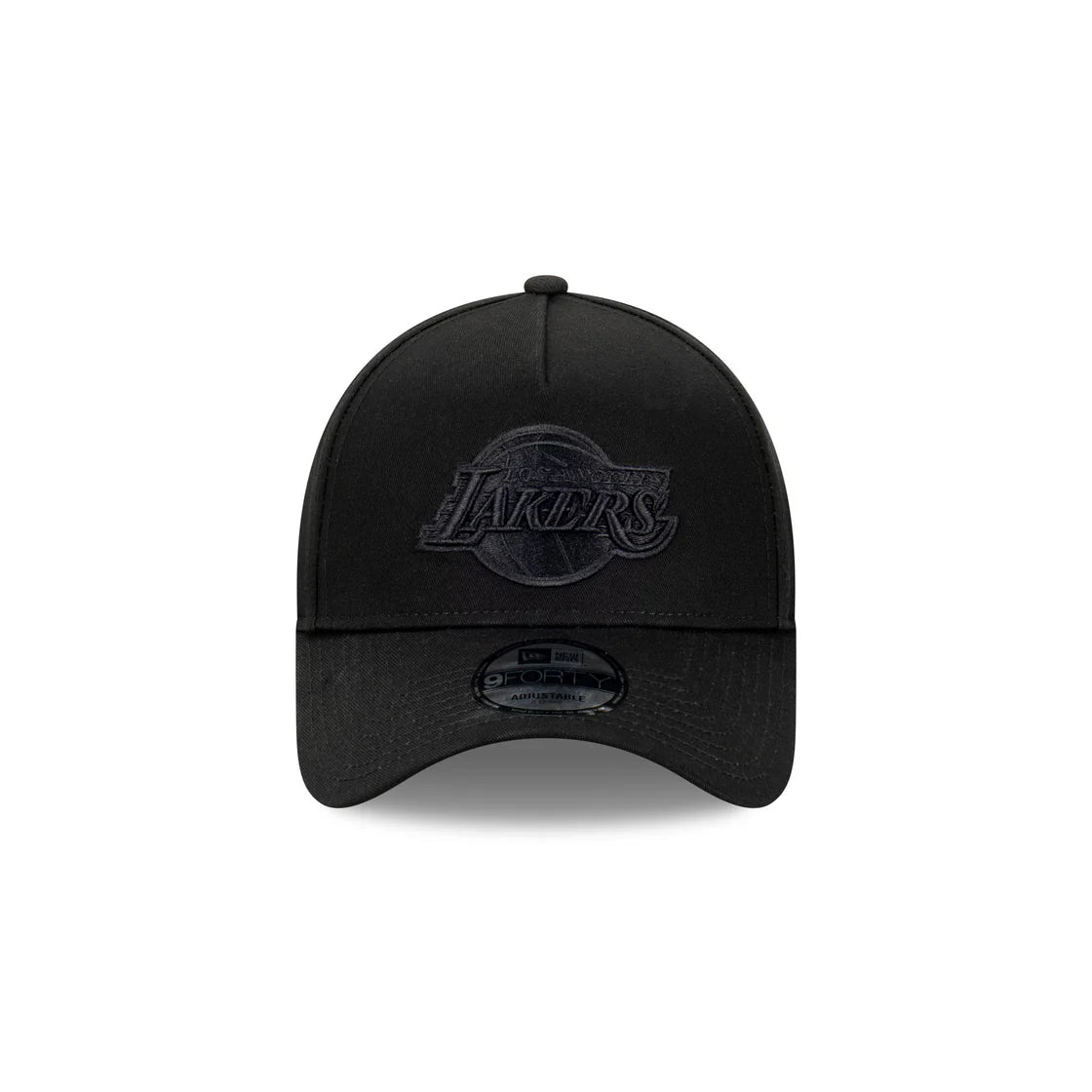 The Los Angeles Lakers NBA Essentials Black on Black 9FORTY A-Frame Snapback features an embroidered black Lakers logo on the front panels of a pitched structured crown with a snapback enclosure at the back.