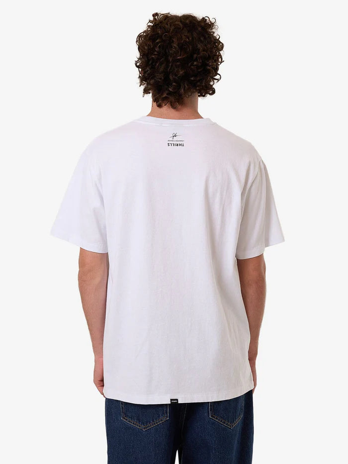 Step into bold, creative style with the Anarchy JAMES ADAMS Merch Fit Tee in White. Designed for those who love graphic impact, this men's tee is a fusion of James Adams' unique documentary-style photographs and Thrills' print detailing and custom wing. Made from cotton dry hand jersey, it’s soft, lightweight, and breathable with a relaxed fit for effortless styling and a ribbed crewneck for a polished finish.