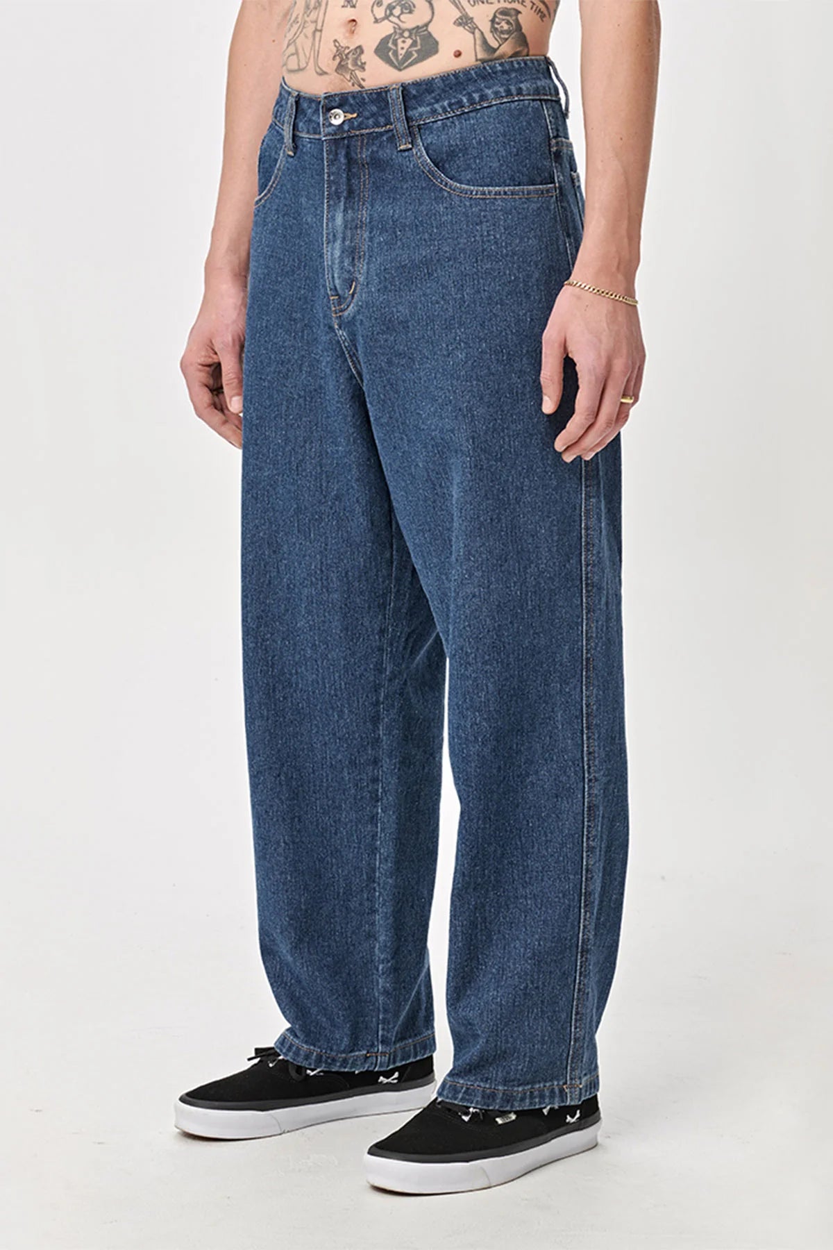 The signature Bull Denim 91 Pant in Blue is a fixed waist baggy fit. Features extra wide cut leg in a washed denim, they have an oversized waist with an extended rise, roomy thigh, and slightly tapered cuff.