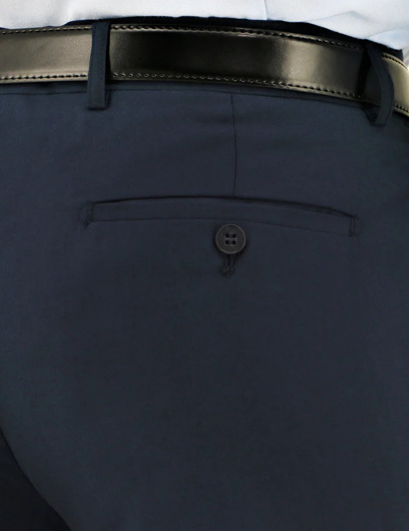 How any man can survive without a navy suit is beyond us. It's almost criminal! This simple slim fit trouser features a zip and button closure, two front pockets for convenience and rear buttoned pockets, just for something extra.