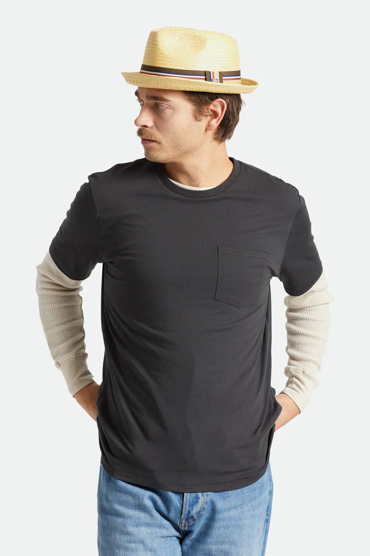 The Castor is a traditional menswear fedora with a strong pinch and bold crease. It’s made with medium-stiff paper straw embellished with a grosgrain outside band and metal crest pin. It has 50+ UPF and an adjustable interior sweatband making it a flawless companion for sunny days.