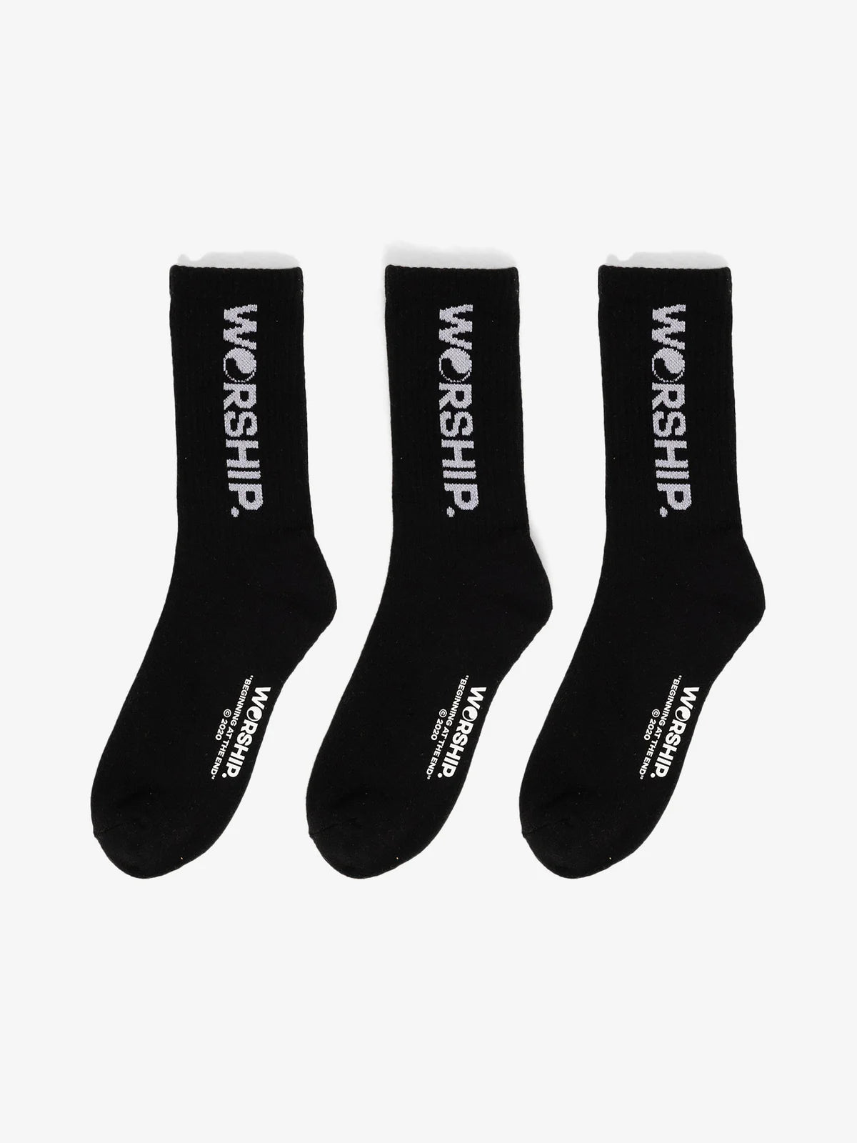 - The Core Socks 3 Pack in Black is a minimalist essential for everyday wear. Each pair is available in one size, featuring a bold, contrasting jacquard and printed branding on the soles. Built for durability and comfort, these graphic socks are made from a premium blend of cotton, polyester and elastane.