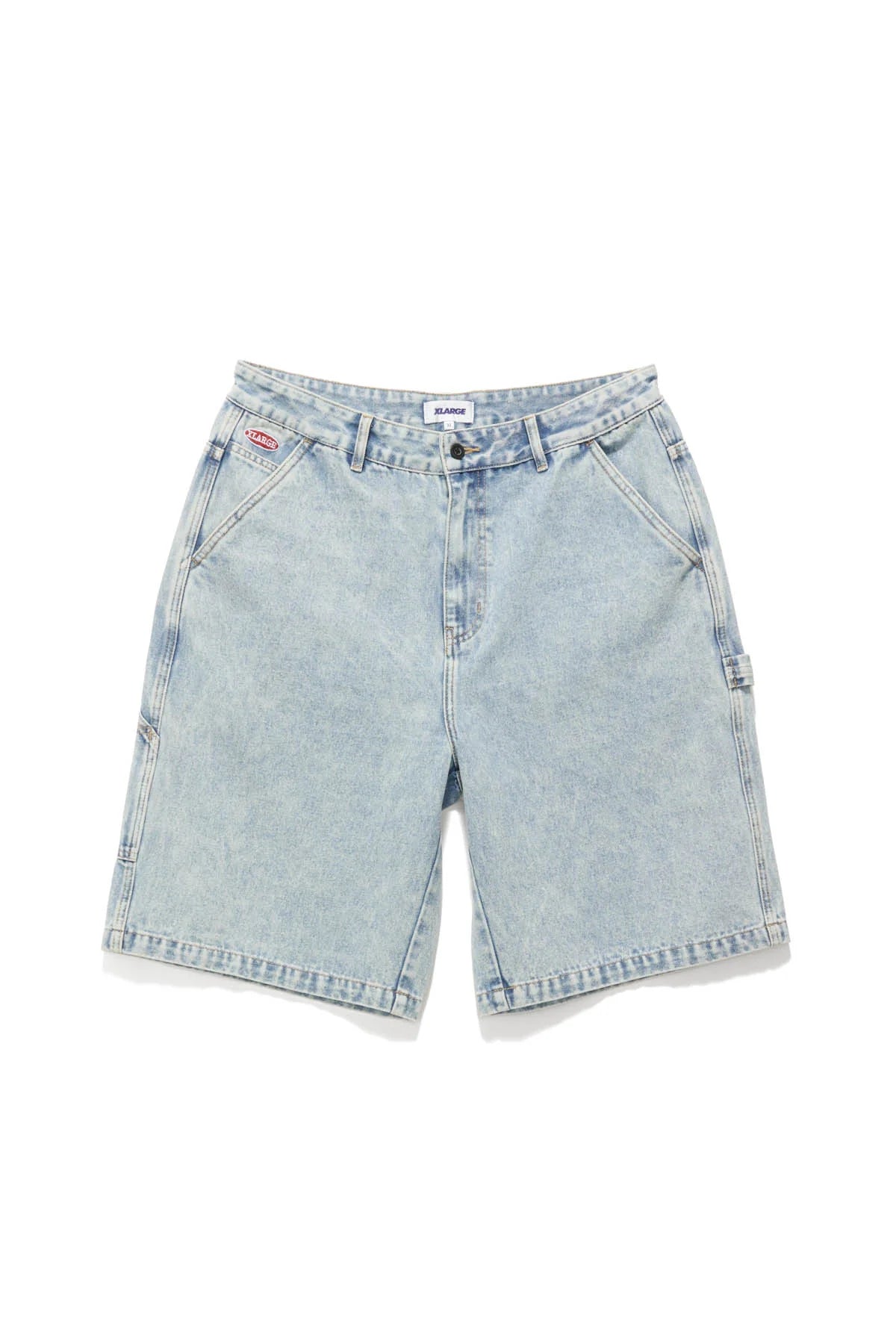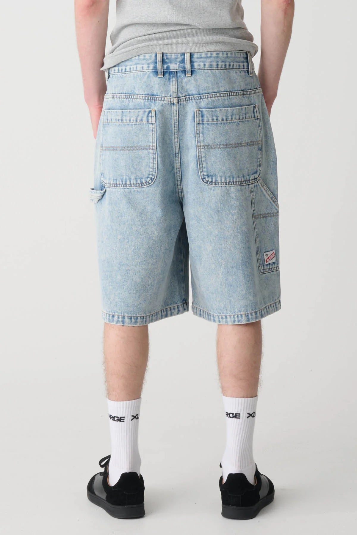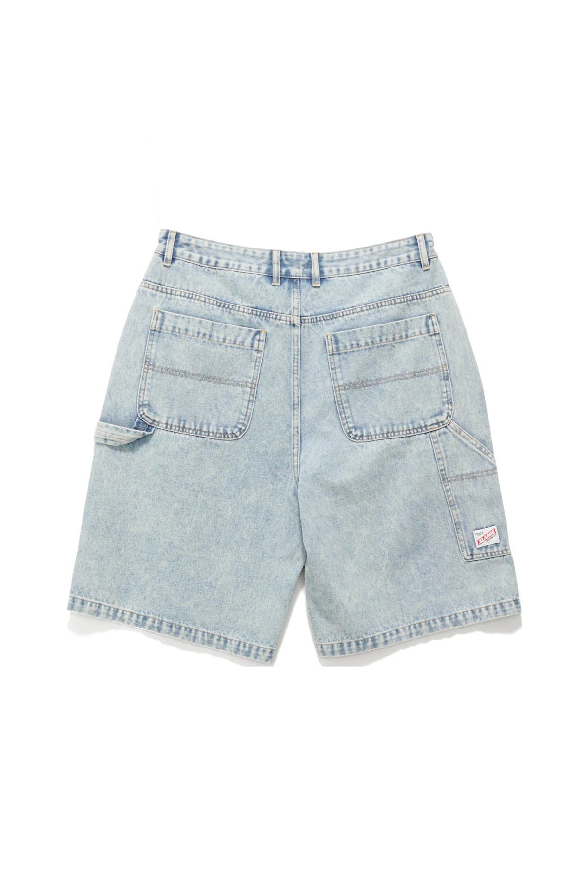 The Denim Work Short in Bleached Indigo is a fixed waist baggy fit. Features extra wide cut leg in a washed denim, they have an oversized waist with an extended rise, roomy thigh, and slightly tapered cuff