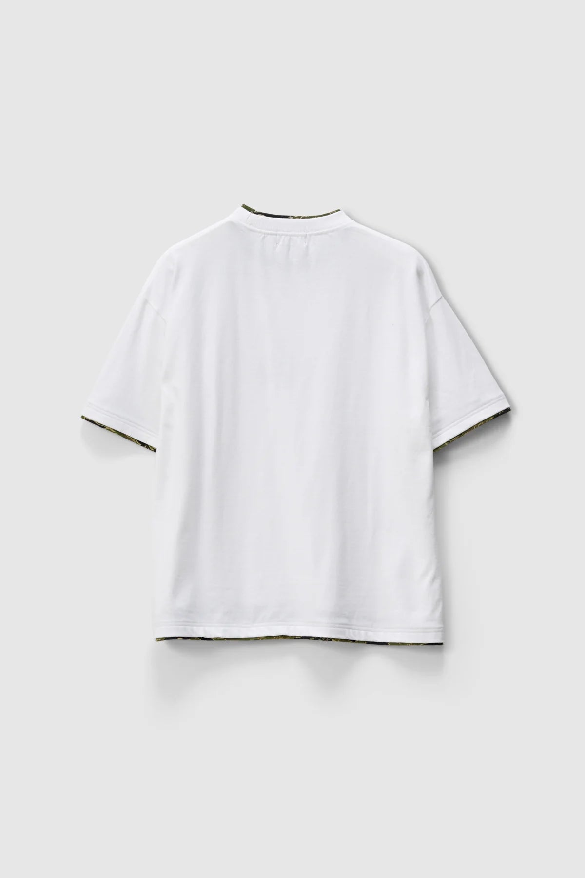 The Double Layer Gorilla Fit Tee in White is a slightly cropped short sleeve tee in our boxy fit. Featuring camo printed jersey layer at neck, sleeves, and hem. Constructed from a heavyweight carded cotton jersey, this tee features elevated prints and premium trims.