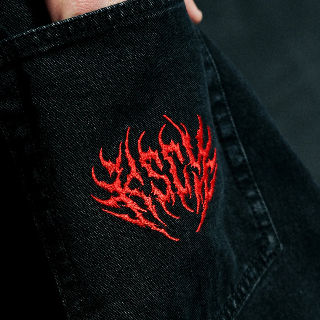 The K6 Denim Jort in Worn Black is the go to Jort in the range. A slightly baggy, straight leg shape, embroidery detail and an internal shoelace belt.