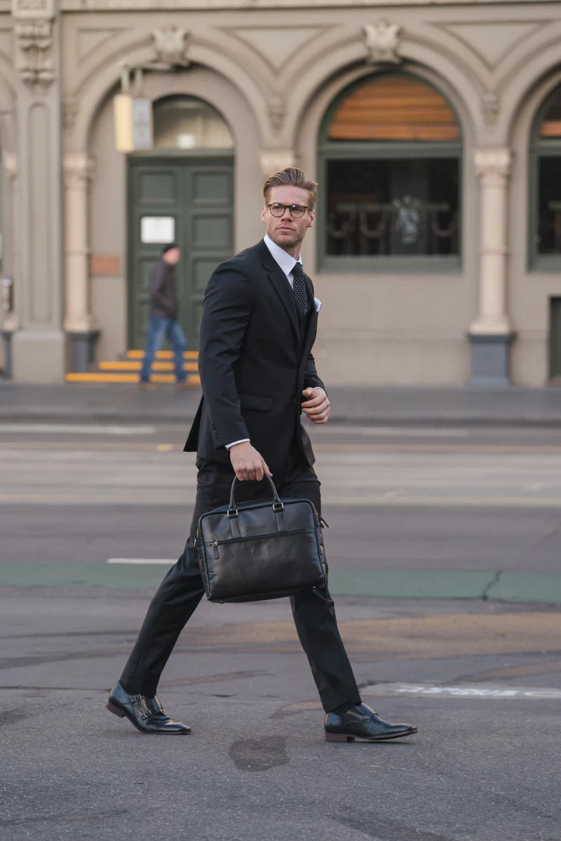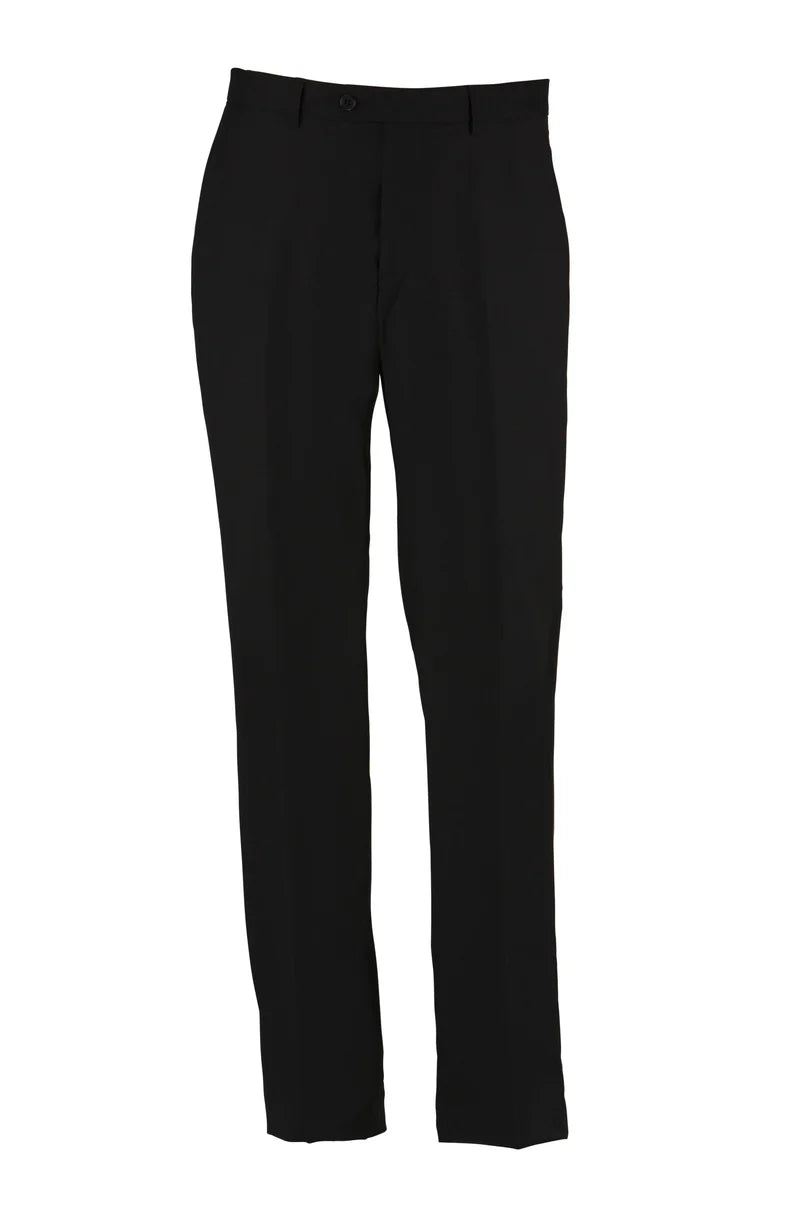 The Boston Lyon Black Wool Trouser is a comfort fit trouser with a plain black pattern and two pockets.