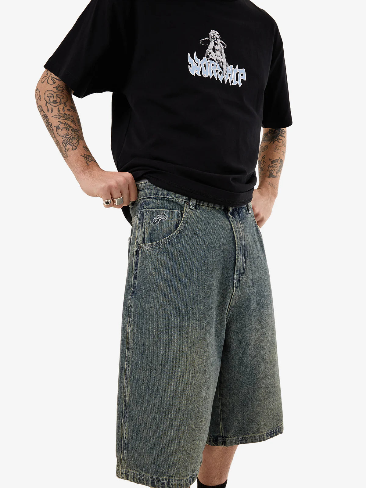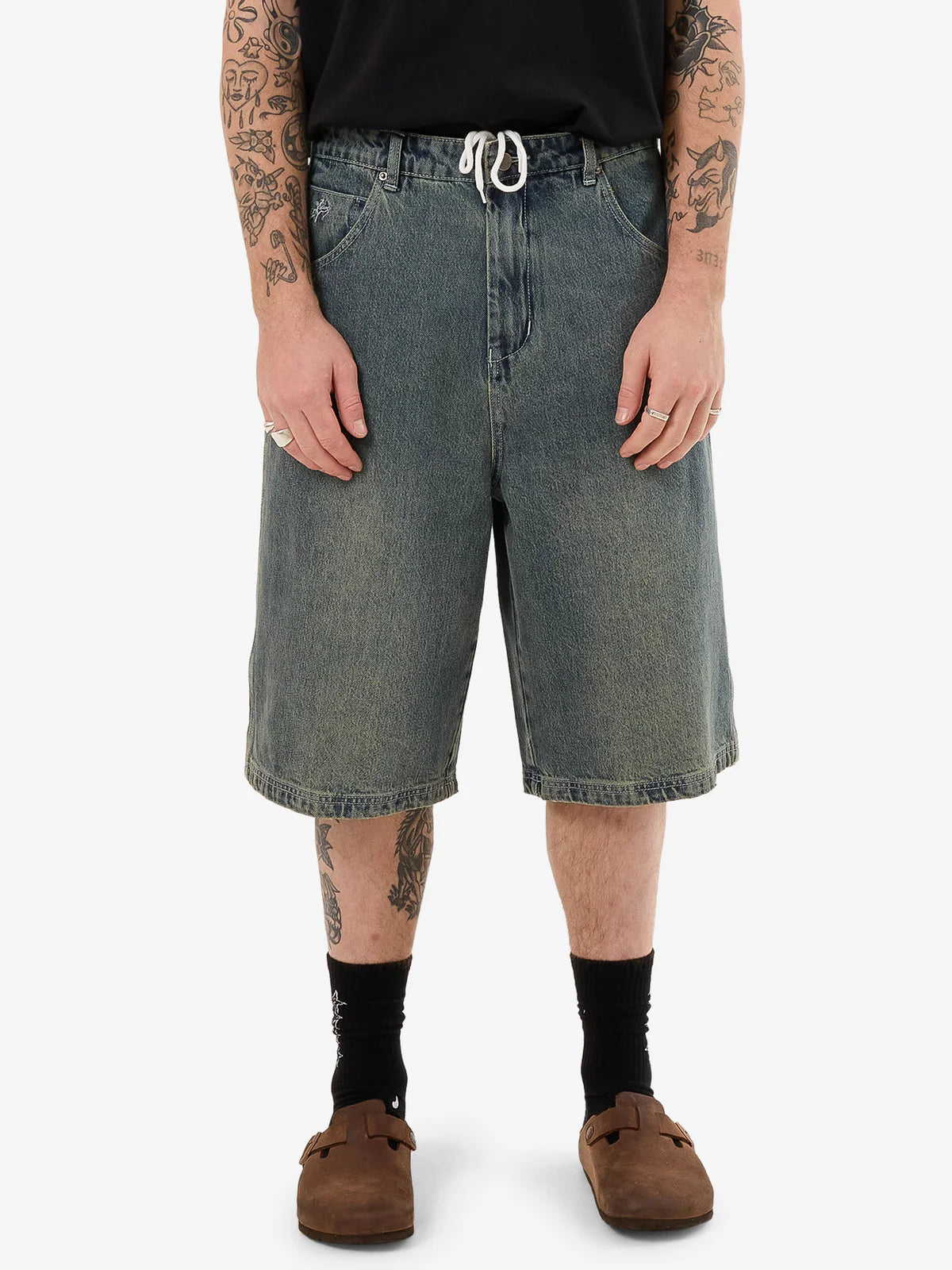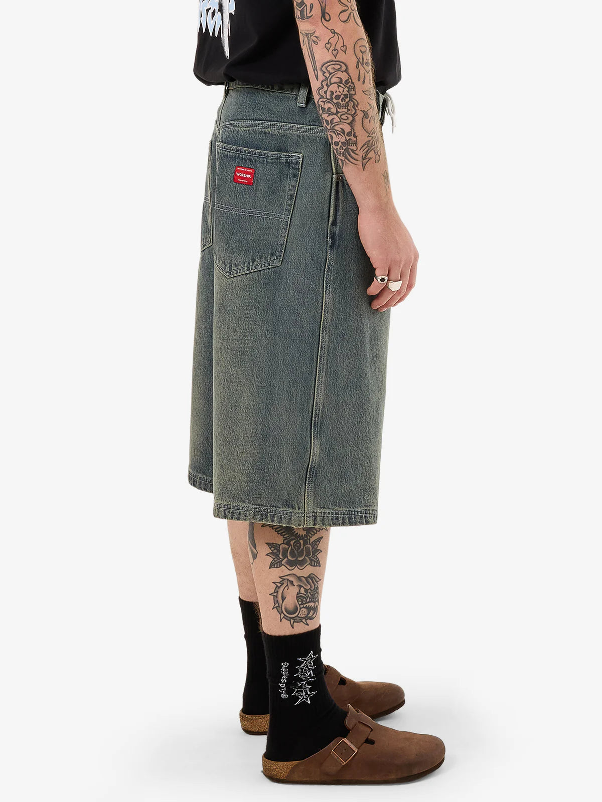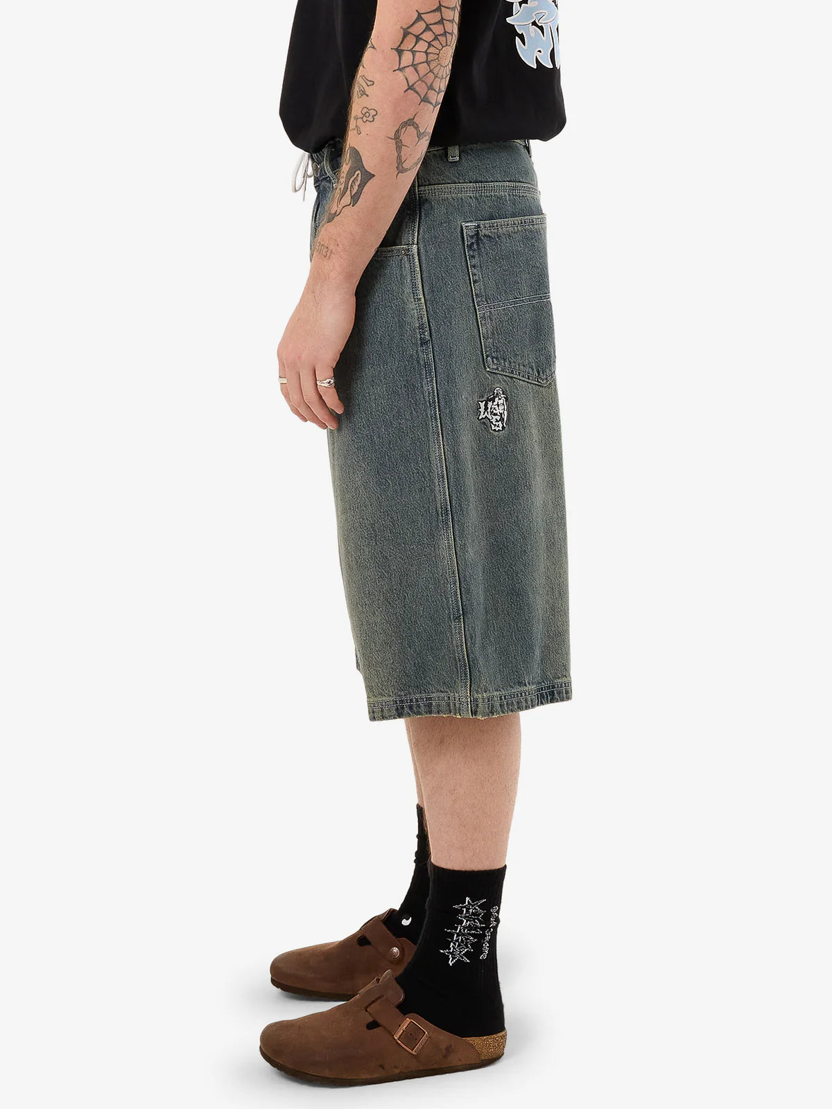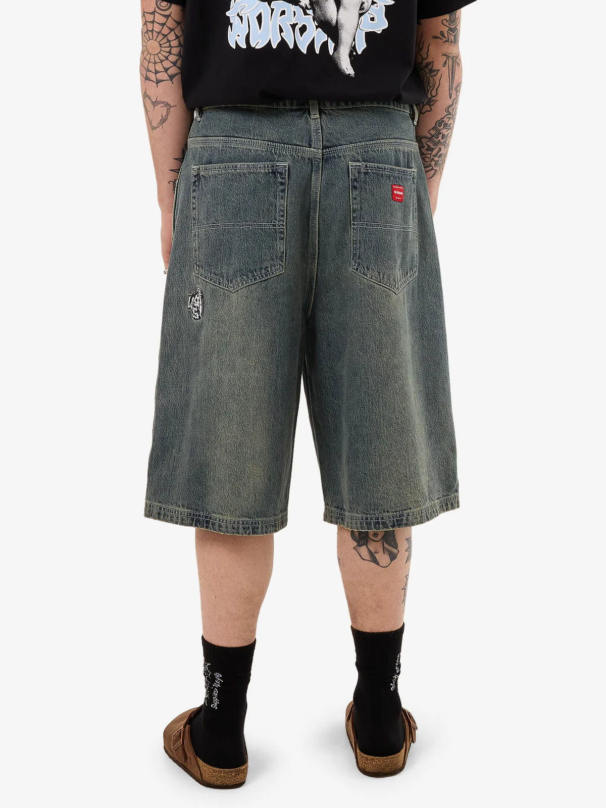 - The Mortality Dozer Jean Short in Blue Haze combines vintage-inspired appeal with a relaxed, baggy fit. Made from 14.2oz cotton denim, these heavy-wearing shorts offer a soft yet sturdy feel for all-day comfort. Designed with a knee-length cut, classic five-pocket styling, belt loops and a subtle embroidered detail on the back pocket for an authentic, timeless appeal.