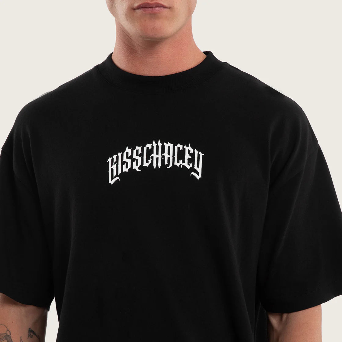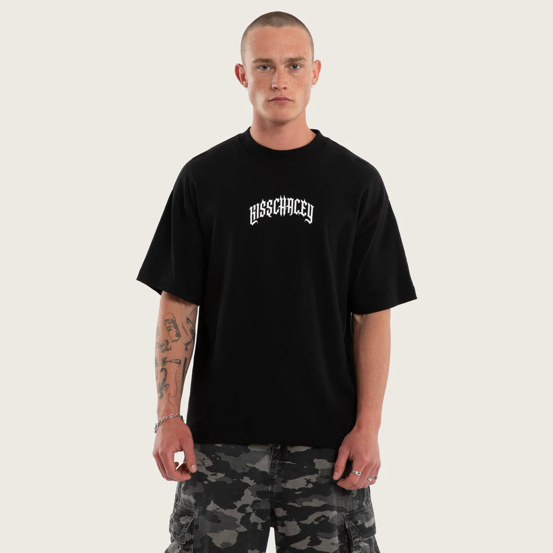 Introducing the Seek Heaven Street Tee in Jet Black from KSCY's latest collection. Featuring a box fit through the body with a slightly cropped length. Designed from midweight 100% Cotton, this tee features a dropped shoulder, relaxed sleeve and high thick neck ribbing.