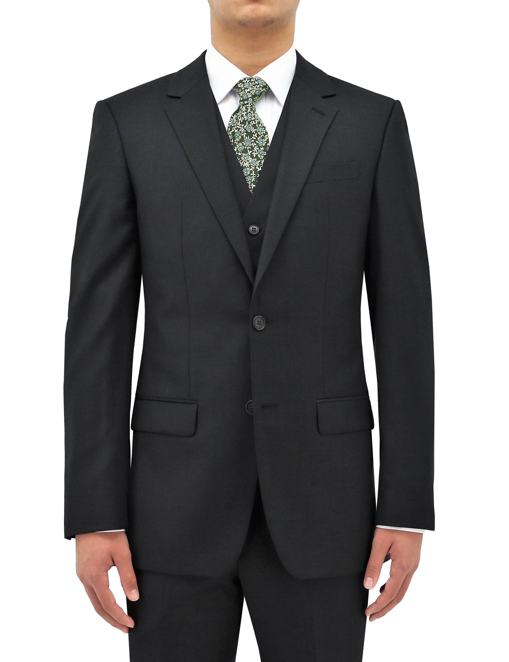 The Shape 106 Charcoal Wool Suit Jacket is a slim fit single-breasted jacket with a plain black pattern, flap pockets and a notch lapel.