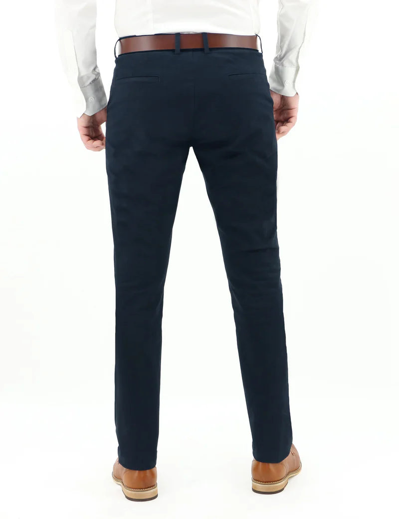 Made from a cotton stretch fabric, this slim fit chino features a tapered leg and a plain navy colour palette.