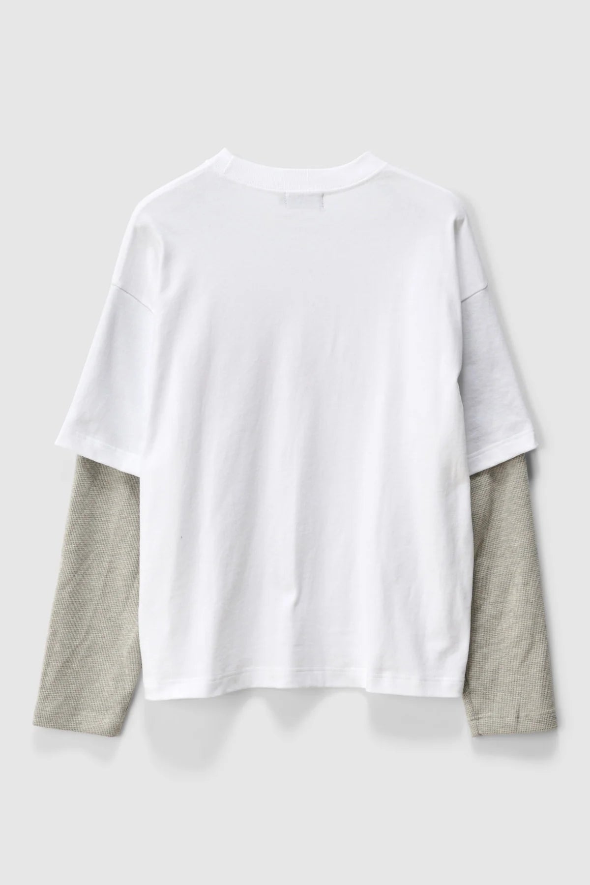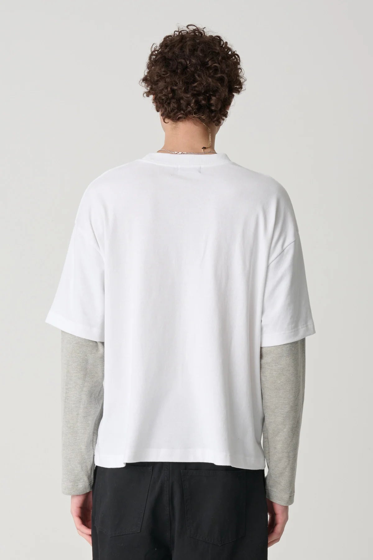 The Sport Double Layer LS Tee in White is a slightly cropped short sleeve tee in our new boxy fit, featuring double layer waffle knit long sleeve.