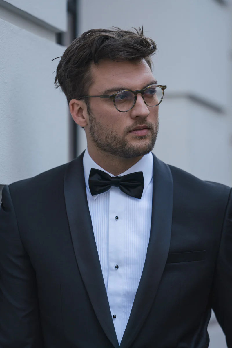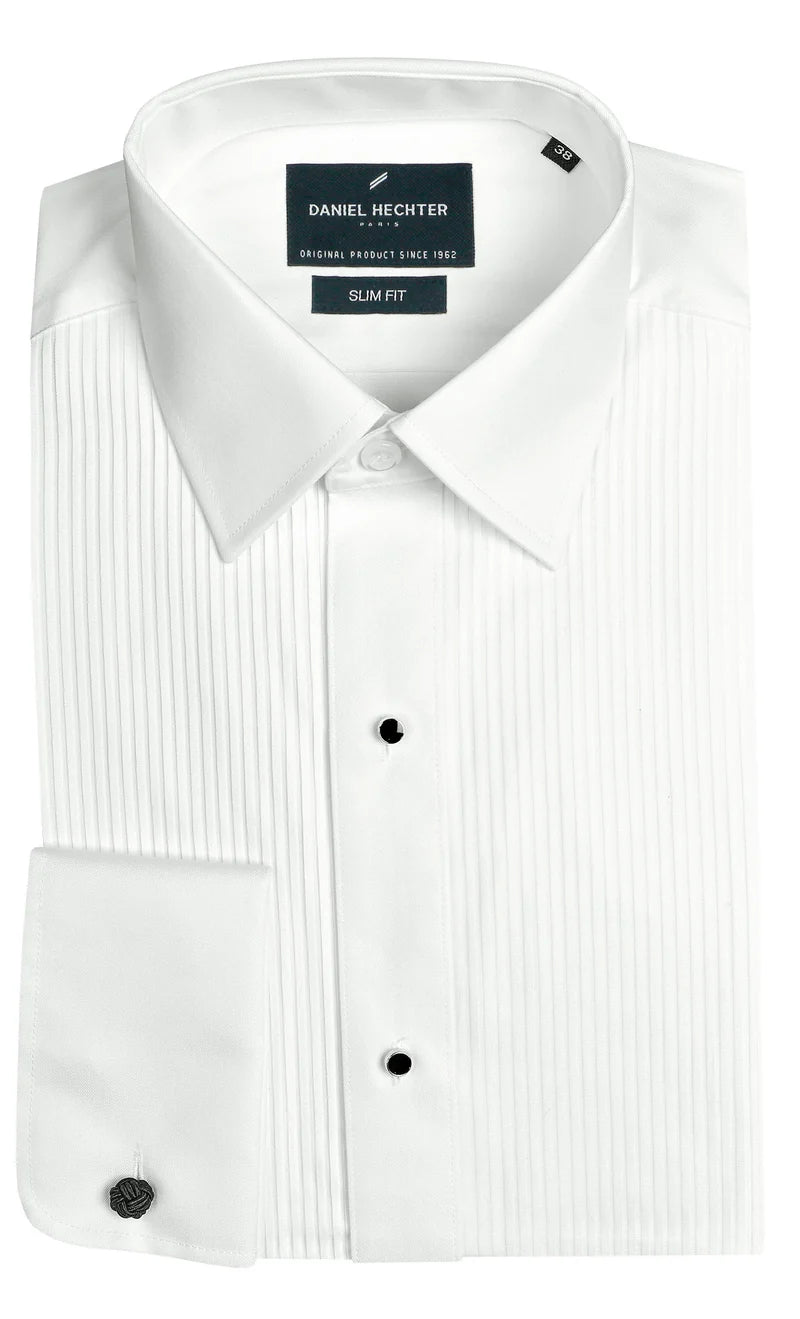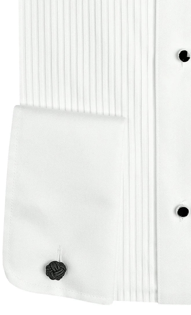 Made from a cotton blend fabric, this slim fit dinner shirt features a pleated frill placket, black stud buttons and a french cuff.