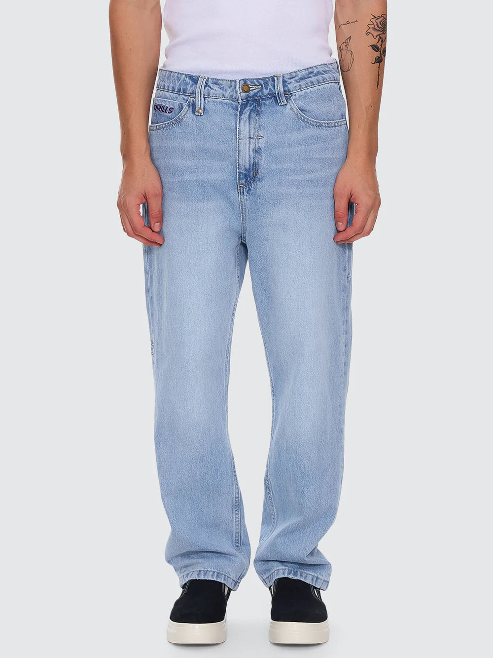 Easygoing with a vintage edge, the Starpower Slacker Relaxed Denim Jean in Endless Blue combines the perfect baggy jeans fit with a rugged, worn-in blue finish. Made from durable 14.2 oz cotton denim, these men’s relaxed-fit jeans offer a roomy, loose-leg silhouette that brings serious comfort and easy movement without compromising on style. The endless blue denim wash keeps things light and versatile, making them a killer choice for laid-back days or nights out. Classic 5-pocket styling, belt loops, and signature Thrills patch branding on the back pocket bring just enough detail to elevate this everyday men’s clothing staple. Whether you’re pairing them with a flannel shirt, oversized vintage tee, or crewneck fleece, these baggy denim jeans fit right into your casual street style rotation, a definite must-have for any season. Tough, timeless and easy to wear—this is the kind of denim that does all the heavy lifting without trying too hard.