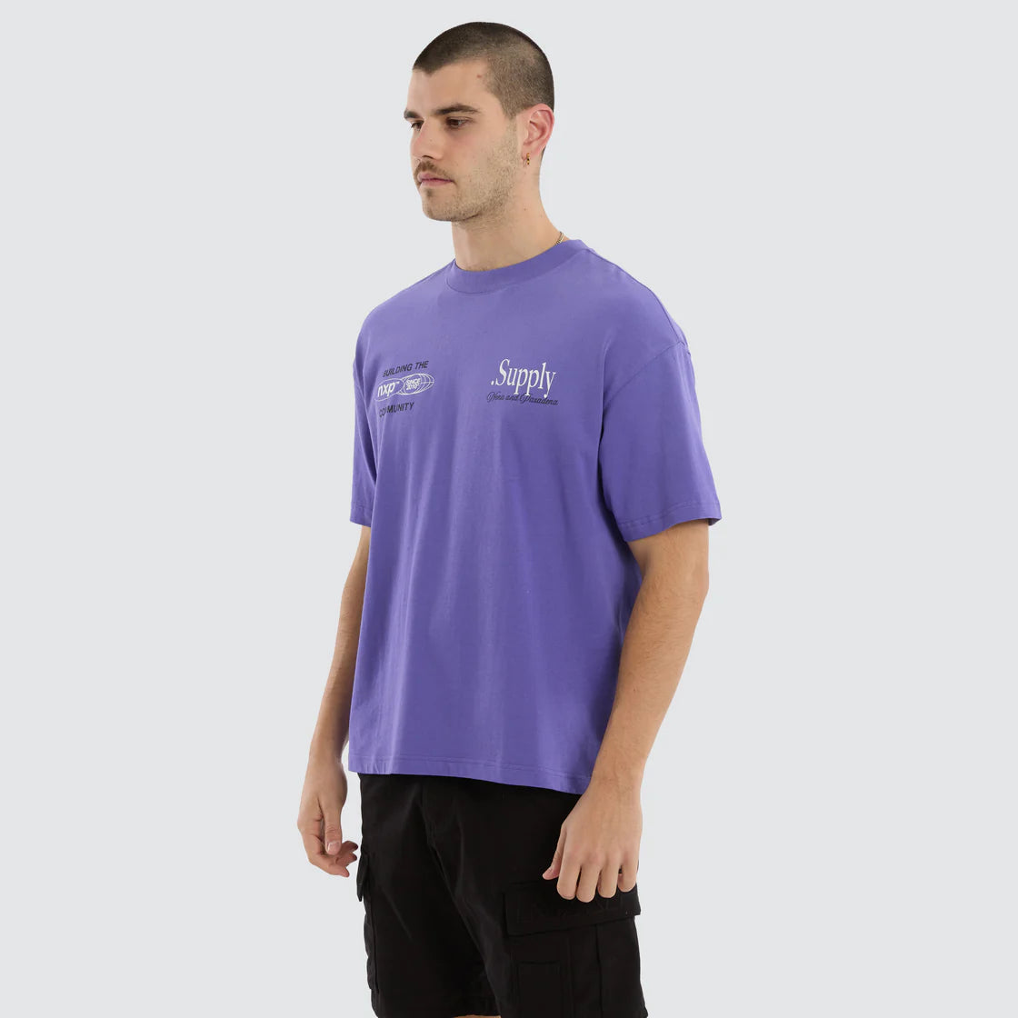 The Union Raptor Tee in Purple Opulence showcases a box fit with a regular length, dropped shoulder, baggy sleeve, and thick neck ribbing. Crafted from midweight sunbleached 100% cotton.